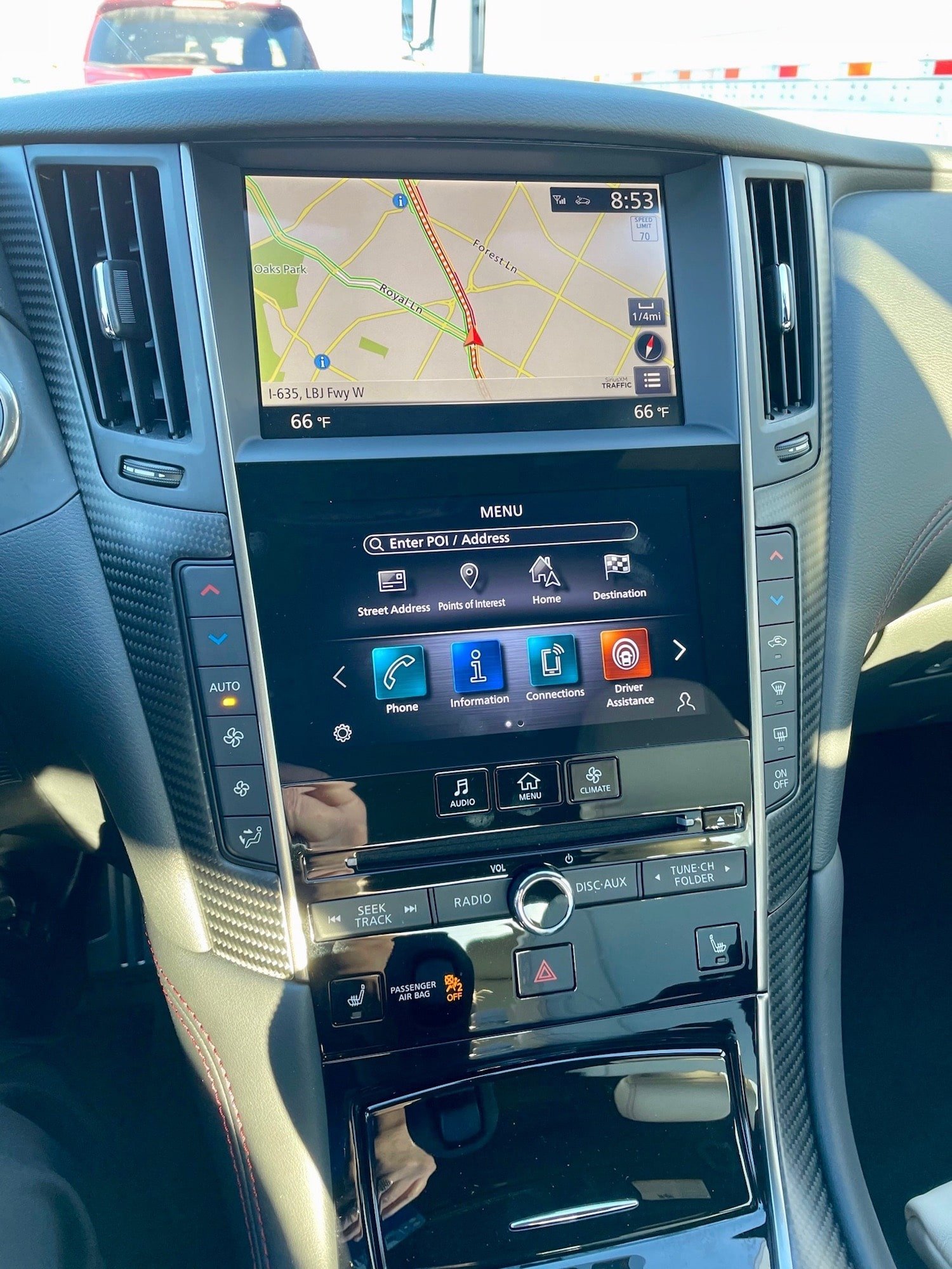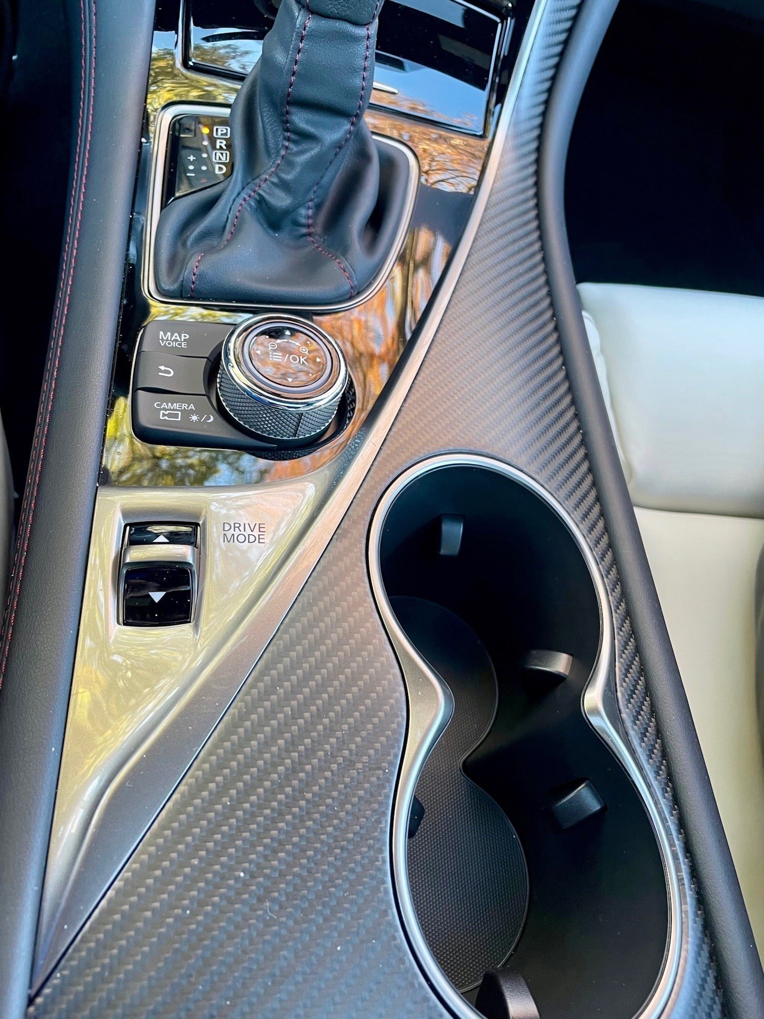 The center console is nice-sized and carbon fiber surrounds the gearshift and flows into the center stack, it looks terrific. Infiniti uses a dual screen setup. The upper screen operates the navigation system and 360-degree camera and operates from a round knob just below the gearshift. Also there is the drive mode selector that allows you to choose from Personal, Sport Plus, Sport, Standard, Eco, and snow. As usual, the Sport Plus mode is where I spent most of my time.