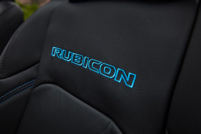 The 2021 Rubicon has very nice bolstered leather seating with stitching and there is also stitching across the dash and throughout the door panels. From behind the multi-function steering wheel, there is a configurable driver info center in the middle of the colorful gauges.