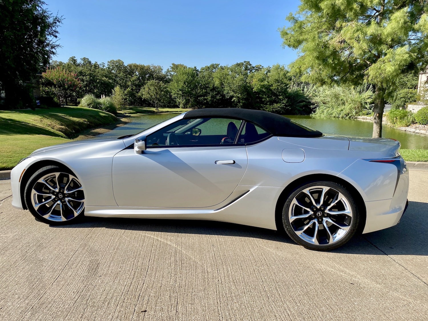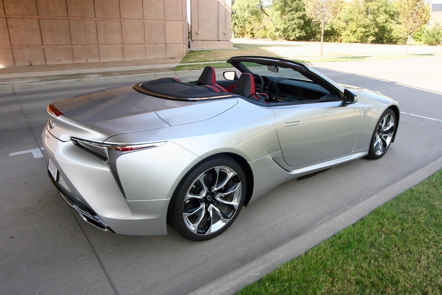 The exterior of the LC 500 Convertible is stunning. Smooth, sleek body lines look fantastic from every angle. Sharp creases on the hood flow down into the front end that showcases a large Lexus grill flanked by arrowhead daytime running lights and triple-projector LED headlights. The body-colored door handles are flush with the doors. It rides on optional 20-inch 10-spoke forged alloy wheels with Dark Graphite Finish ($1,210).