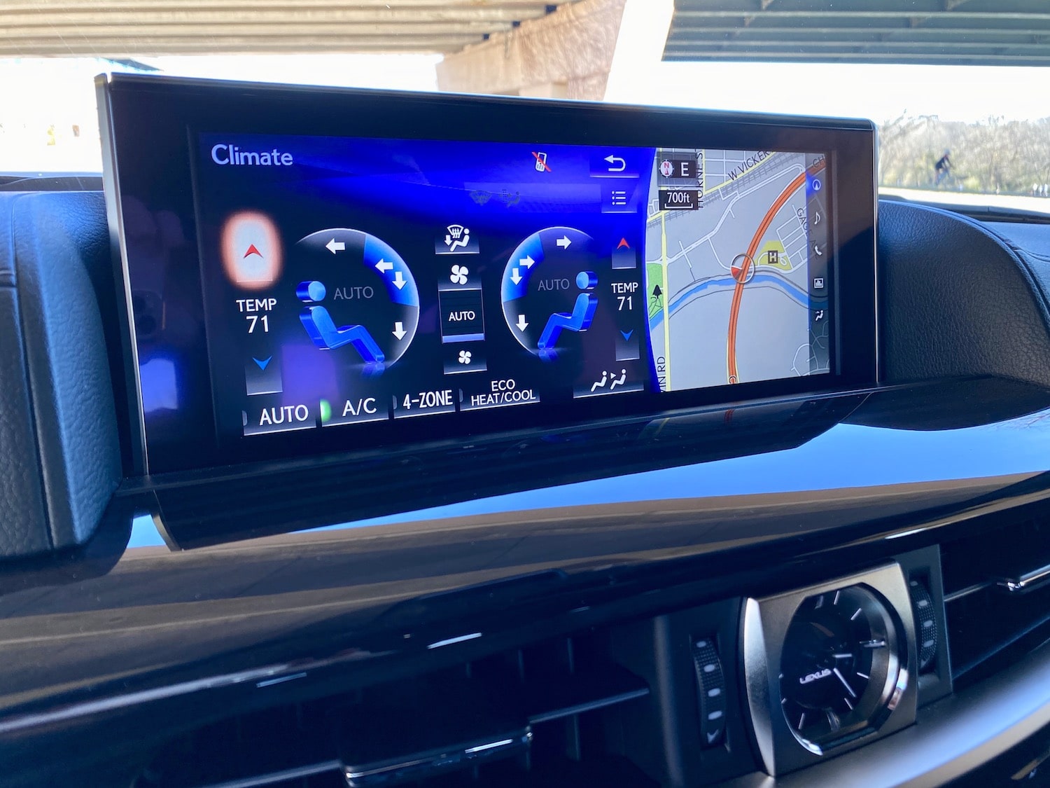 Technology is a hit and miss story in the LX. The 12.3-inch infotainment screen with navigation, which is not a touchscreen, is certainly a hit. It’s one of my favorites in the industry with great graphics and great resolution. It can split three ways to display various information, including available four-zone climate with concierge which coordinates the temperature of the heated steering wheel and cabin areas. You control the infotainment system with a joystick like controller on the console. The multi-media screen houses a backup camera with a panoramic and multi-terrain monitor.
