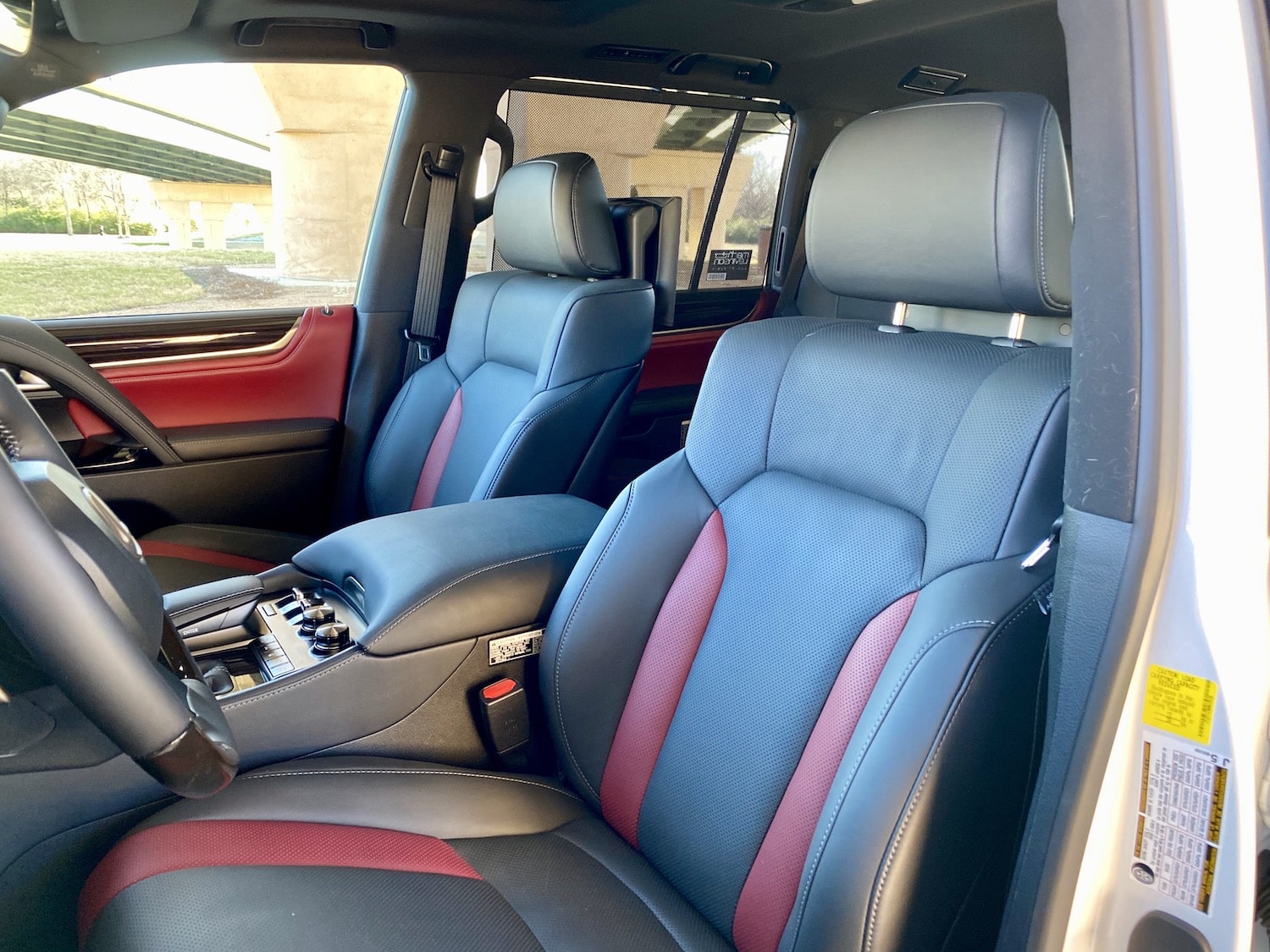 Sure the LX may not have had a total redesign in awhile, but the look of the current generation still holds plenty of allure for me in Eminent White Pearl, worth the extra $425 paint charge in my book. It looks sharp with all the contrasting black chrome accents from the Inspiration Series package. That includes the 21-inch wheels, black Lexus grille with a black chrome surround, black headlamps with smoked lenses, black fog lamps, window accents, dual tone mirrors, door handles, roof rails and more. Lexus’ terrific premium triple-beam LED headlights flank the grille up front. Anti-slip running boards with integrated courtesy lights adorn the sides.