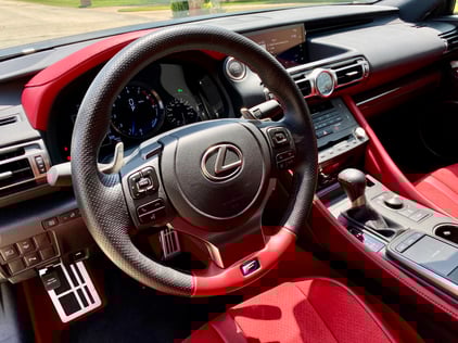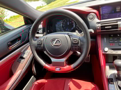 You’ll find red carbon fiber trim on the door armrests and above the glove box. Soft touch materials abound, and are mixed with silver accents on the door panels where you also find black Mark Levinson speakers. An F-Spec leather-trimmed steering wheel greets you from the driver’s seat. Above it you’ll see the digital-analog instrument cluster. The digital display gives you various driver info and a G force meter.