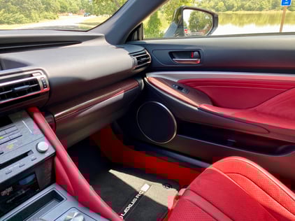 The RC F Fuji’s red hot interior more than lives up to the exterior’s promises. You open the door to Red Circuit Alcantara-trimmed F Spec sport power front seats with silver accents and F Spec logos on the headrests. The driver’s seat is 10-way power adjustable and feels terrific with bolstering that holds you perfectly in place.