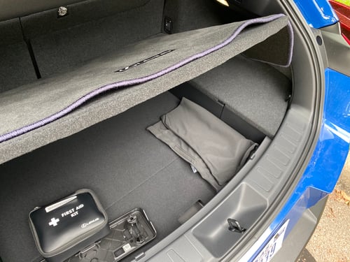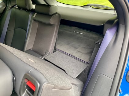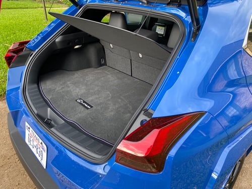 You’ll get a manual folding 60/40 rear seat split. In the cargo area, the UX250 offers more utility space for 2021. Capacity increases from 17.1 to 21.7 with the standard adjustable rear cargo deckboard, a great use of space. A nice Lexus-logo'd cargo mat looks great as well as a 12-volt and hooks to hang things. An available hands-free foot-activated power rear door opens at a nice speed.