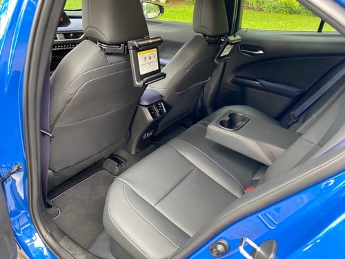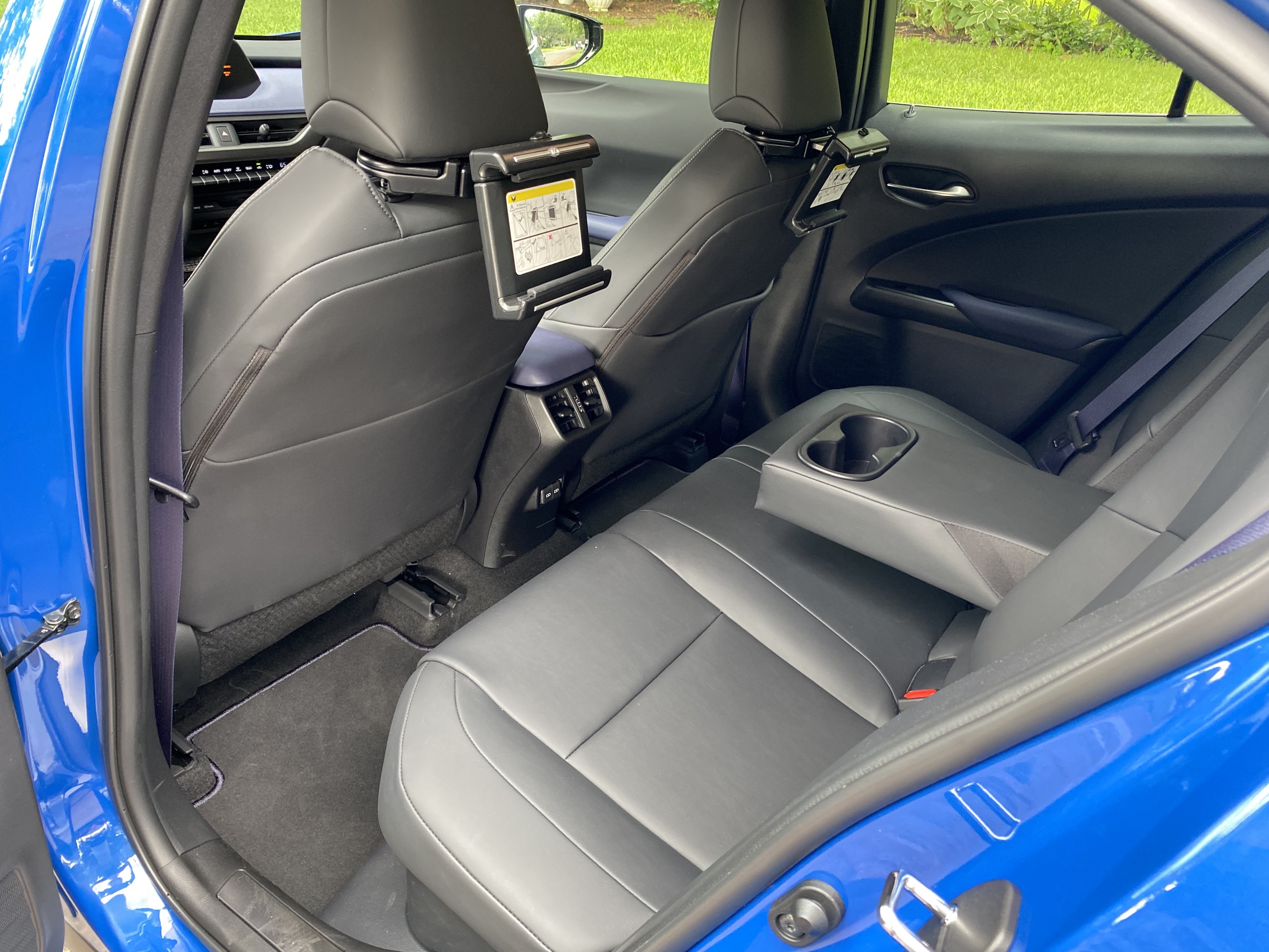 The 5-passenger UX feels wide and while there is a nice legroom in the front row, it’s not as generous in the back seat. Second row passengers get A/C vents and a drop down armrest with cupholders.