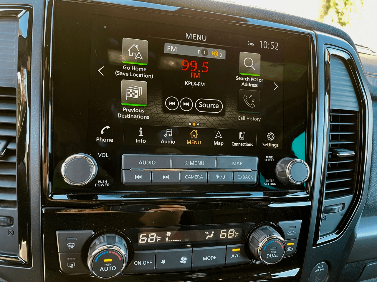One of the big improvements to the Titan is the interior, it’s much nicer than in years past. Comfortable seats greet you with the Pro-4X logo embroidered on them as well as the floor mats. You’ll find orange stitching on the seats, the door panels, the center console, and across the dash. Look up and you’ll see a massive panoramic moonroof with a power sliding cover.