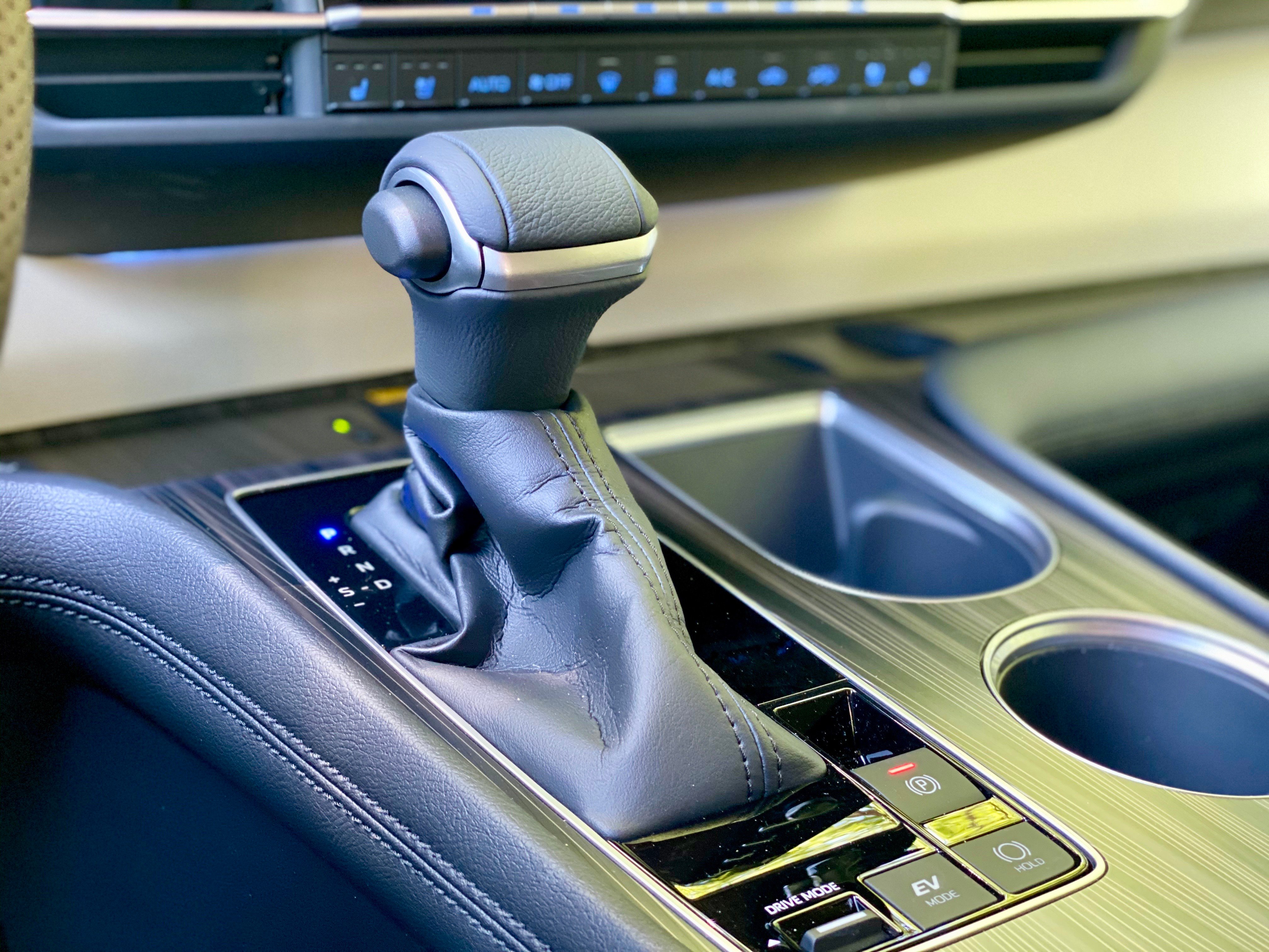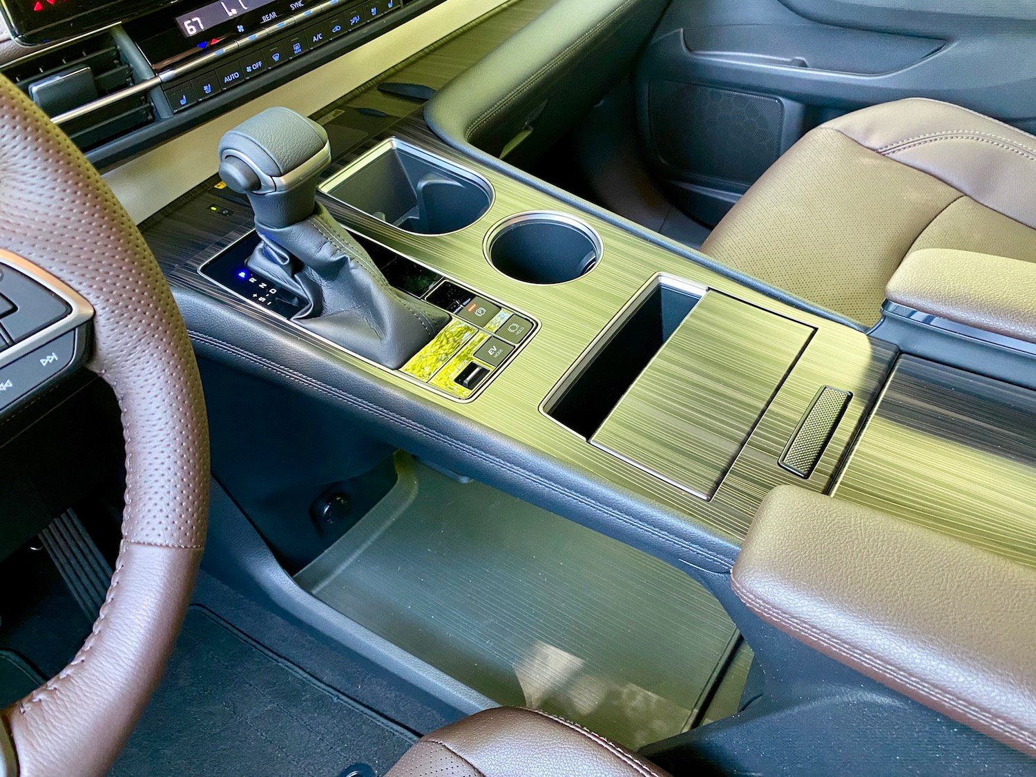 A "bridge console" area sits noticeably high and over a large passthrough storage area. Ergonomically, it works well with the height of the driver's seat. The "bridge" houses a leather-wrapped gear shifter, electronic parking brake, auto brake hold and drive mode select. A standard wireless charger is set back into the dash area. A nice-sized center console bin - surrounded by nicely padded armrests on both sides - opens easily with the push of a button to reveal storage space and two USB ports.