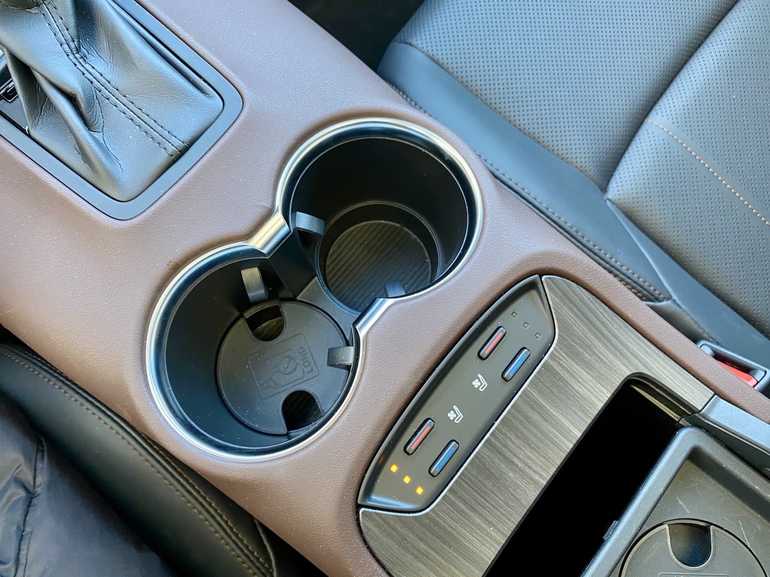 The SofTex-trimmed black seats with nice contrast stitching keep you riding in comfort, with an 8-way power adjustable driver, and 4-way power passenger seat. Interestingly, you slide the large center console back to access hidden heated and ventilated seat controls.