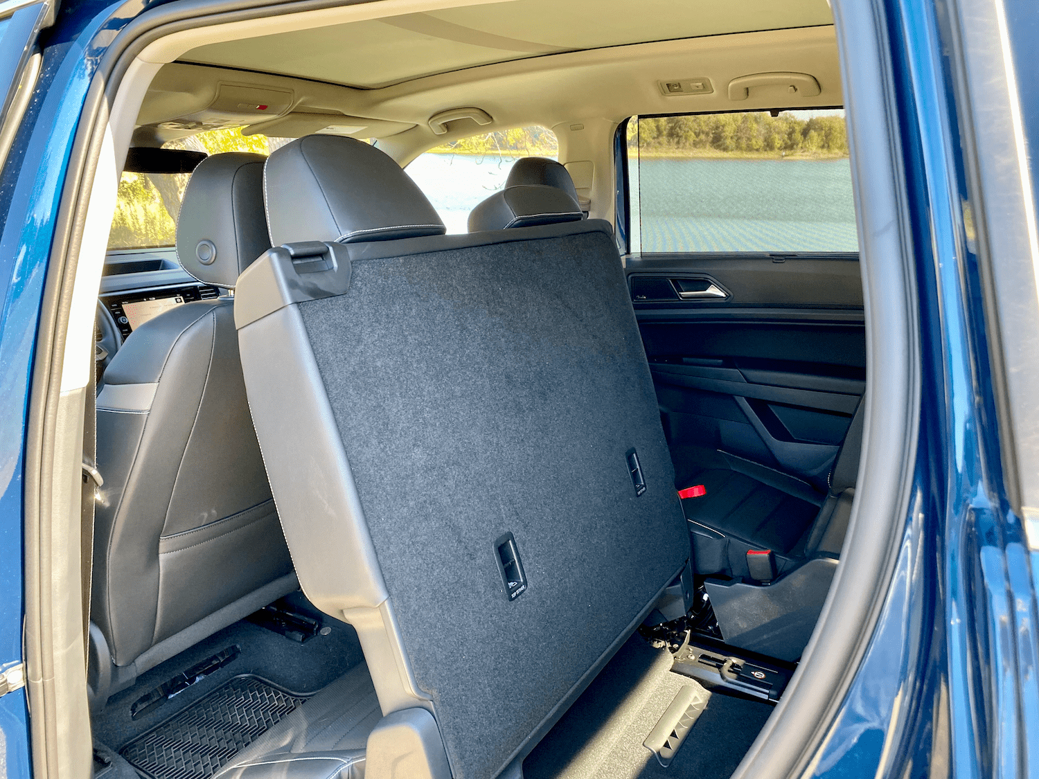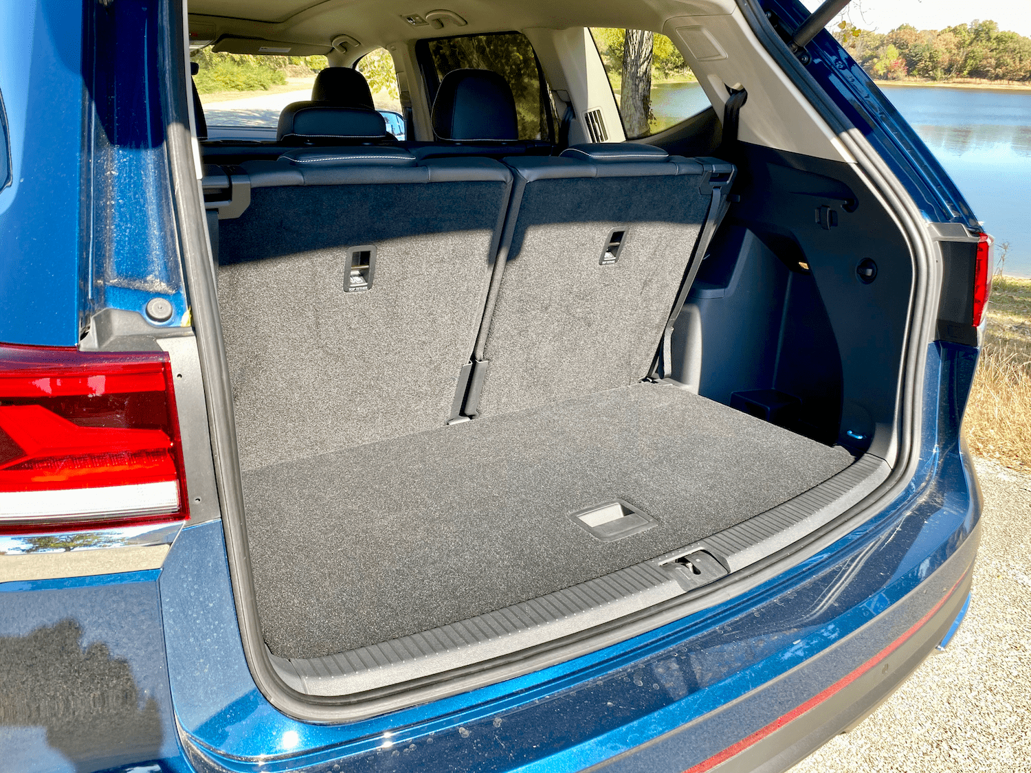 The second and third row slide forward with a lever. I’d love to see a power option. VW designed the second-row bench seats to tilt and slide forward with child seats in place. You’ll get the usual 60/40 split folding 2nd row and 50/50-split folding 3rd row. I also loved the nice, yet durable-looking rubber mats through the SUV. An available hands-free Easy Open kick sensor tailgate is easy to use and worked on my first attempt.