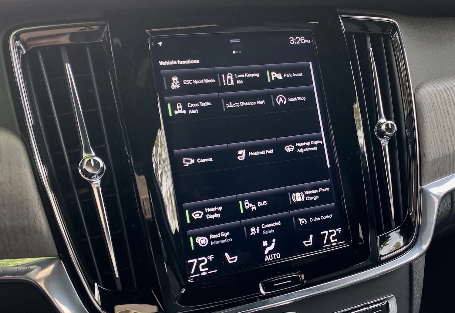The V90s hardware is polished and premium. You’ll find the start/start knob, not a push button, on the center console. It’s where you also find the leather-wrapped gear shifter, drive mode selector and auto brake hold.