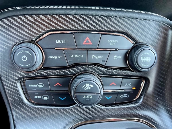 Moving to the inside, the interior is nicely done and quite spacious. I love the optional Carbon & Suede interior package, and the air-conditioned and heated power seats are very comfortable. The Hellcat comes loaded with just about everything you can imagine, except a moon roof.