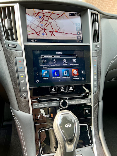 .Infiniti uses a dual screen setup, which frankly, is a little antiquated. The upper screen operates the navigation system and 360-degree camera and operates from a round knob just below the gearshift. Also, there is the drive mode selector that allows you to choose from Personal, Sport, Standard, Eco, and Snow.