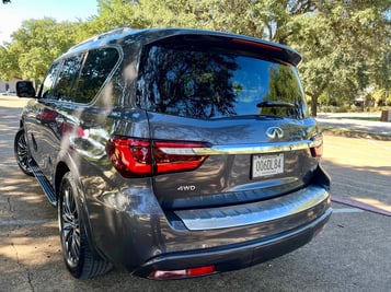 The QX80 sports a huge grill, a very high belt line with contoured sides, huge 22” wheels, and a distinctive rear end with a spoiler. It is an attractive SUV but its size alone is a bit intimidating.