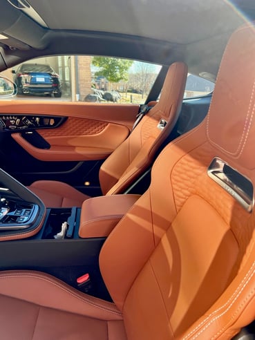 Jag’s are known for beautiful interiors and that certainly holds true for this F-Type. Both front seats are bolstered, heavily stitched, and offer a combination of smooth and patterned leather that matches the door panels.