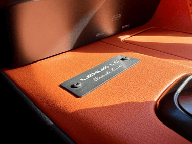 A Bespoke Build-badged center console hosts the hand-stitched leather-wrapped gear shifter, brake hold, Lexus remote touch interface and EV mode.