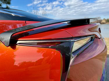 My example showcases many custom features available for the Bespoke Build. They include a carbon fiber roof and all-new Manhattanhenge interior color, both exclusive to Bespoke Build. Others options, the carbon fiber air wing spoiler and 21-inch forged black alloy wheels with Black finish, were previously only available on the LC Inspiration Series.