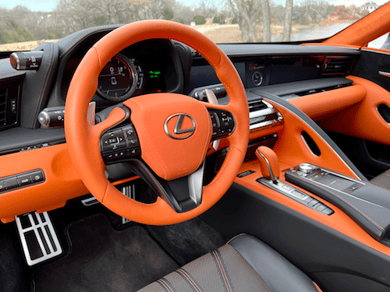 The LC 500h is a gorgeous, sleek, sophisticated coupe that looks stunning in an attention-grabbing Cadmium Orange metallic exterior hue with dark chrome window molding. A unique dark gray chrome mesh grille spans the front flanked by Lexus' excellent triple-beam LED headlights.