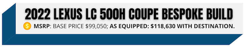 Welcome to the era of the Lexus Bespoke Build - an era that elevates the brand to whole new playing field with next-level customized luxury. Case in point, the first-ever Bespoke Build program for the brand's flagship performance coupe the Lexus LC 500. As showcased on my test drive model this week, the 2022 Lexus LC 500h Coupe. Trust me, if driving up doesn't wow your neighbors (which it will), showing them the interior will. Not even my previous - all excellent - experiences behind the wheel of LC 500 models prepared me for such an incredibly crafted vehicle.