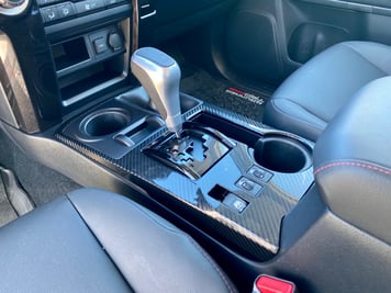 The more old-school than fancy center stack is home to dual zone climate control with easy to grip large dials and other climate control buttons. On the carbon-fiber patterned console area you find a leather-wrapped and silver-trimmed TRD logo shift knob and heated seat controls. You’ll find the Multi-Terrain Select and Crawl Control on the above center console area.
