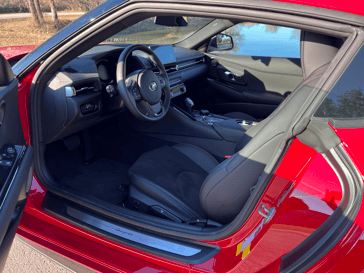 The Supra’s looks can be summed up rather succinctly: RED HOT. It’s one of the best-looking two-seaters out there, if not the best in my book, with perfect portions. A long hood, sculpted profile and distinctive tail end make for a gorgeous car as does its aerodynamic double-bubble roof that harkens back to the 2000 GT. Eighteen-inch cast aluminum wheels look super sharp set against the Renaissance Red 2.0 hue.