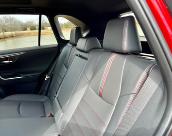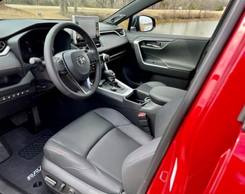 The RAV4 is roomy with plenty of head- and leg-room. The slightly reclined back 60/40 rear split seats are slightly raised due to the battery. A drop-down center armrest provides cupholders. Back seat passengers also get air vents. An optional kick sensor height-adjustable power liftgate operates quickly. There is plenty of trunk space though slightly less than the standard RAV4. A cargo cover hides your valuables.