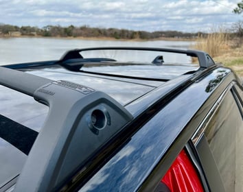 Black-painted power side mirrors fold and are heated. In the rear, you find dual chrome exhaust as well as LED tail lamps. Up top, a low profile roof rack sports optional cross rail bars. Blue Toyota logos in front and back designate its hybrid status.