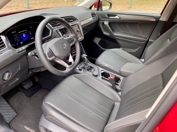 My Tiguan SE’s Titan Black V-Tex leatherette interior is well-designed with silver trim, white stitching and some glossy areas on the door panels and lower dash. Leatherette seating surfaces and a leatherette-wrapped steering wheel are on the firmer side. Both front seats are heated but only the driver’s seat offers power adjustments.