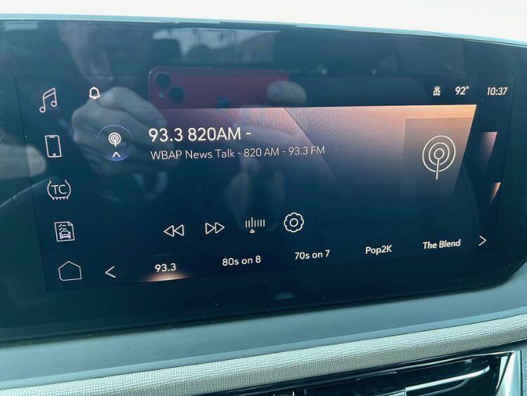 There is an 8” color driver information screen that is easy to read, but not colorful. You can configure the information from the flat-bottomed heated steering wheel. Center dash is an 11” touchscreen that houses the navigation system, rear camera, runs the wireless Apple CarPlay and wireless Android Auto, the 6-speaker sound system, the Bluetooth, Wi-Fi hotspot, and SiriusXM. You also get a USB-C, USB-A, and a 12-volt power plug. Below that are your air-conditioning controls, heated seats, and heated steering wheel buttons. Continuing down to the center console, you get the gear shifter, wireless cell charger, a couple of cupholders, and a switch to turn off the start/stop system.