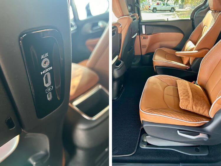 Second row captain chairs are comfortable, and you even get pillows for your back. Headphone jacks and USB-C ports are handily built into the back of the front seats. Leg and headroom are terrific and the second row seats recline.