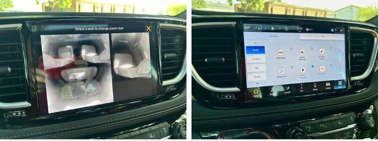 High on the center stack is the terrific 10.1” Uconnect 5 navigation screen. It operates the 20-speaker Harmon Kardon sound system, the nav, the Bluetooth, Apple CarPlay and Android Auto and check out the FamCam that checks on rear occupants. There are a host of apps that provide real-time information. Below the screen are controls for the parking systems and the air conditioning systems.