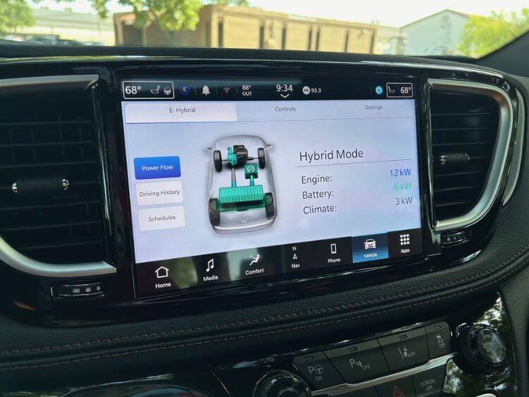 Simply put, here is the way it operates: You plug your van in overnight and then you have 32 miles of driving on just the batteries. Once the battery power is exhausted, Pacifica seamlessly switches over to run on gasoline like every other vehicle. In the center of the colorful gauge cluster, it will tell you the battery range, the gasoline range, and the total range to empty. Pacifica comes with a 6.6-killowatt charger, but I used the Level 2 charger I have in my garage and obtained an 80% charge in about two hours.