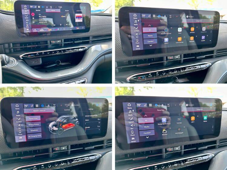 There is an electric car page so you can do a deep dive into the power flow and range, you can hook your cellphone to Bluetooth, activate a Wi-Fi hotspot, see real-time weather in your area, read tutorials, and this is the first EV I remember that has AM radio and I thank the Italians for that!