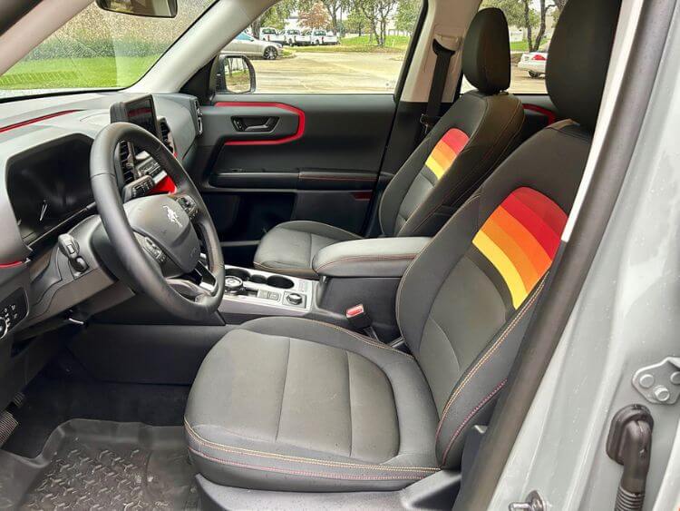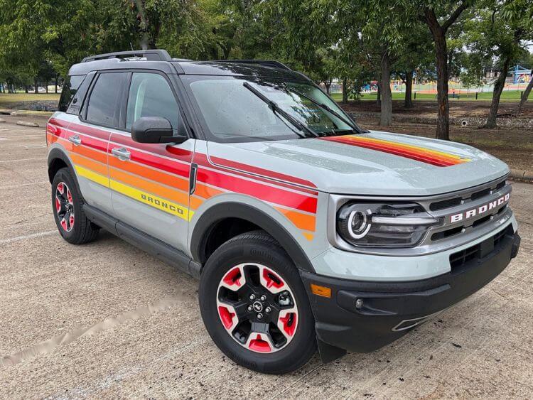 The special edition features red, orange, and yellow sunset-inspired stripes and like the originals, the 2024 Bronco Sport Free Wheeling special edition features reflective red, orange, yellow and silver graphics on the body sides and hood. It features a black roof, 17” wheels that have red insets, a roof rack, and black bumpers. The 1970s called and want their vehicles back!