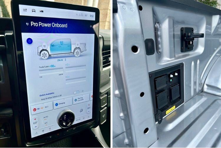 Inside the bed and also the frunk is the Pro Power Onboard with 9.6 kW power outlets to plug-in tools or whatever else is needed. The bed outlets have a 240-volt plug-in that will allow you to run lights to your home in the event of a power outage. Ford says it will run an entire house for up to 3 days. There is no need to carry a generator with you ever again, and you can use the power outlets even when driving. Another really great feature.