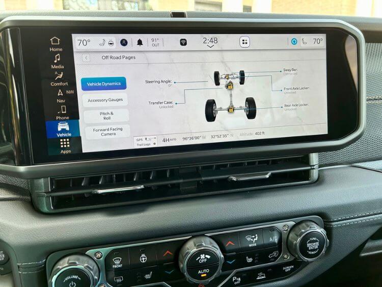 Center dash is the new 12.3” Uconnect 5 system which operates the Alpine sound system, navigation, apps, climate, Bluetooth, Wireless Apple CarPlay and Google Android Auto, voice activation, and vehicle settings. There is also a Wi-Fi hotspot that will run 8 devices at one time. The system works great and is very intuitive. The big screen also provides a backup camera and a front facing camera for climbing those big hills.