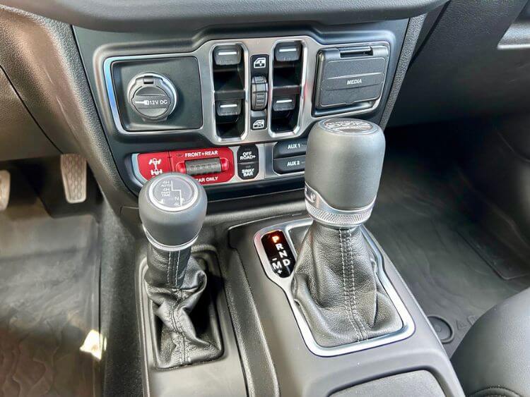 The center console has the gear shifter with Jeep Rubicon 392 on top, your 4-wheel drive stick shifter (again, old school and I love it versus a button), a couple of cup holders, and a two-tier arm rest with storage.