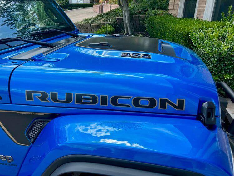 The Rubicon grabs a lot of attention from people, especially in this Hydro Blue Pearl paint with a matching roof. The hood has a large functional hood scoop with a large black decal and 392 emblems on the sides.