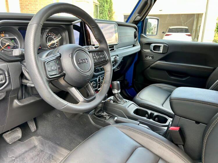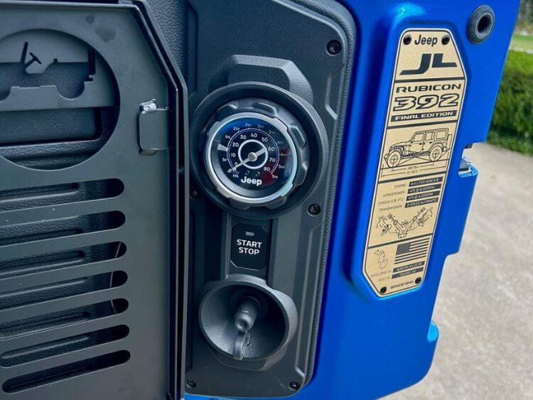 The 2024 Rubicon 392 Final Edition has very nice bolstered leather seating with stitching and the Rubicon 392 logo embossed on the front seats. There is also stitching across the dash and throughout the door panels. From behind the multi-function steering wheel, there is a 7” configurable driver info center in the middle of the colorful digital gauges.