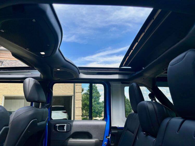 What is fun about Jeeps is you can make them so different. Take the top off (again, I wouldn’t), take the doors off, fold the windshield back and enjoy all the fresh air you could want, or simply push a button to open the Sky one-touch top.