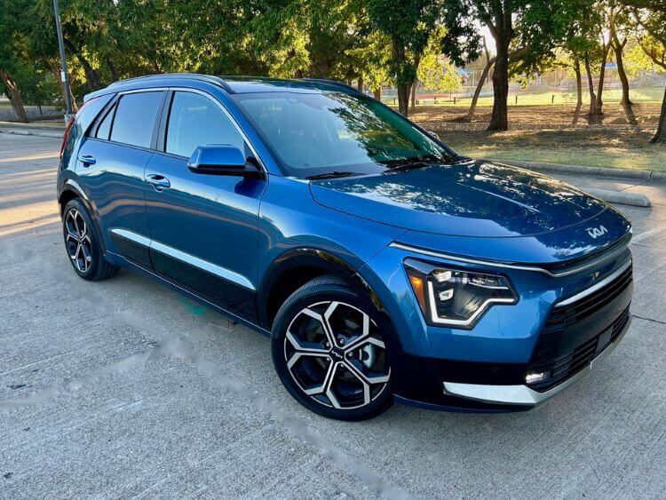 The exterior looks are sharp and crisp in this Mineral Blue color. In case you haven’t noticed, blue is the new hot, hip, and happening color these days, and this one is beautiful. Wide black trim runs along the bottom of the Niro to offset the blue between the front and rear wheels.