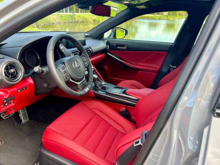 Opening the driver's door had me quickly seeing red. As in CIRCUIT RED. The race-inspired cockpit is awash in it. Even the Mark Levinson speakers get the red treatment. It contrasts with black interior elements as well, and I was particularly partial to the F Sport Performance's exclusive satin trim.