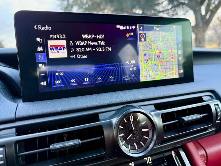As you sit in the 10-way power seats that are bolstered, heated, and air conditioned, you snugly get in place and start to look at the bright and colorful instrument panel. The digital gauges are the most configurable I have ever seen. The gauges are nearly identical to the world-renowned Lexus LFA supercar. The instrument cluster in the IS 500 F SPORT features a dynamic digital display. It moves with a sliding bezel, expanding and retracting digital readouts when information is accessed from the steering wheel and when you change the drive modes. There is start-up animation that is quite entertaining.