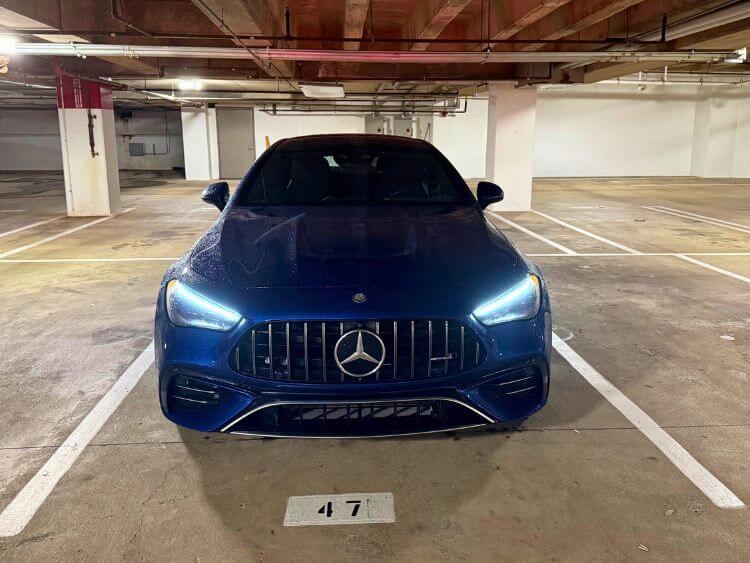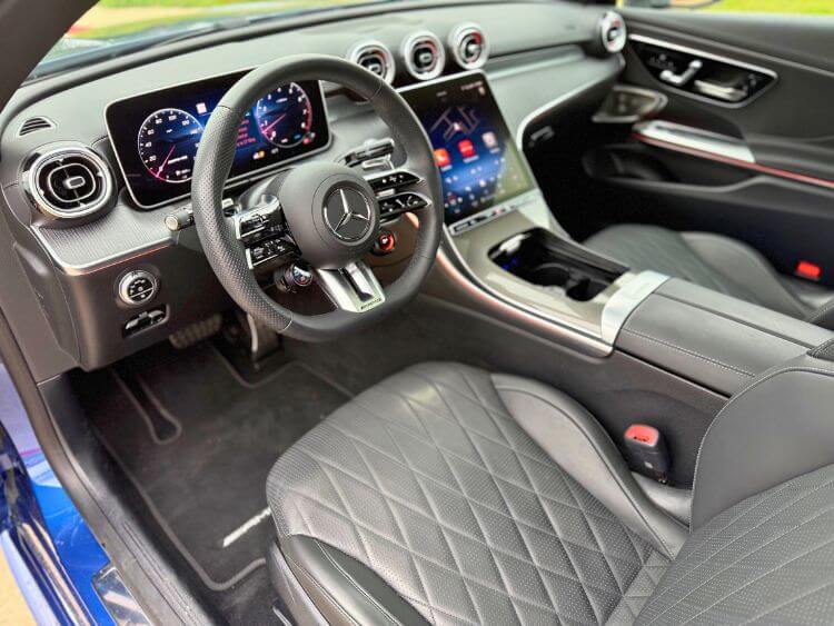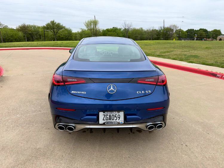 There is a small spoiler on the rear, quad exhaust, and the famous Mercedes-Benz star on the back that doubles as the trunk opener when you press the top of it. My tester came in Starling Blue Metallic, and it is a gorgeous color.