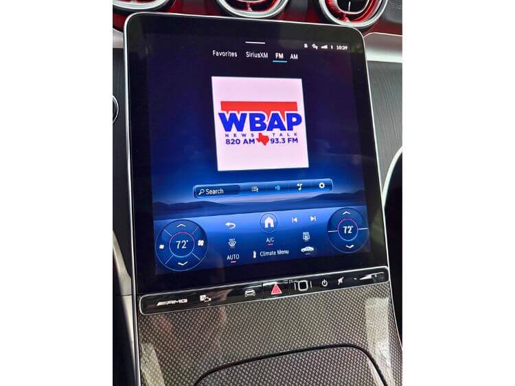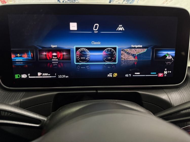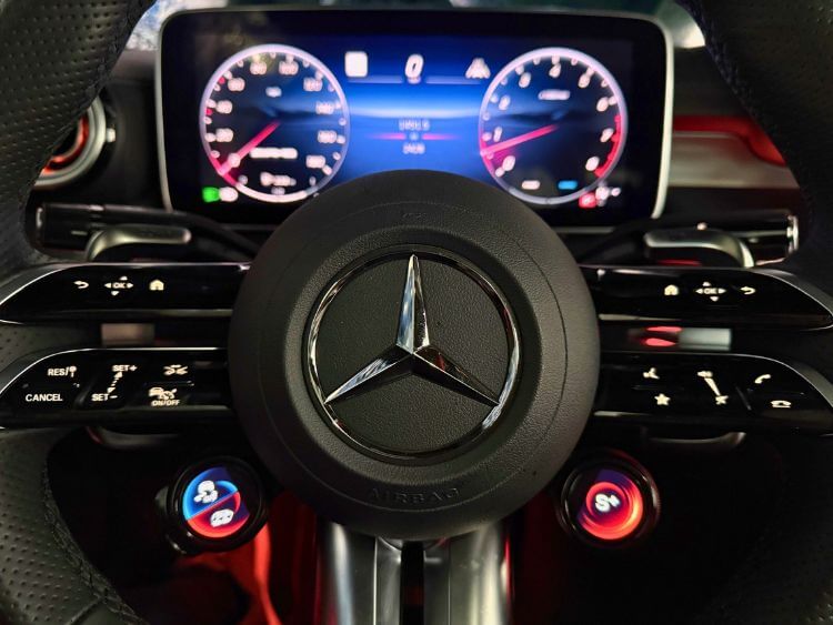 The flat-bottomed AMG Performance steering wheel is wrapped in Nappa leather, it includes buttons and AMG-specific controls to configure the 12.3-inch digital driver display that provides customizable information, with different display styles that include Classic, Sport, and Supersport modes. There are two round knobs on the steering wheel that are part of the AMG Drive unit. The Left Knob is the Drive Mode, and you can choose from Slippery, Comfort, Sport, Sport+, and Individual. The right nob controls custom functions such as suspension stiffness (AMG Ride Control), exhaust sound (quieter or louder), traction control level, manual gear shifting mode, and the start/stop on/off toggle.