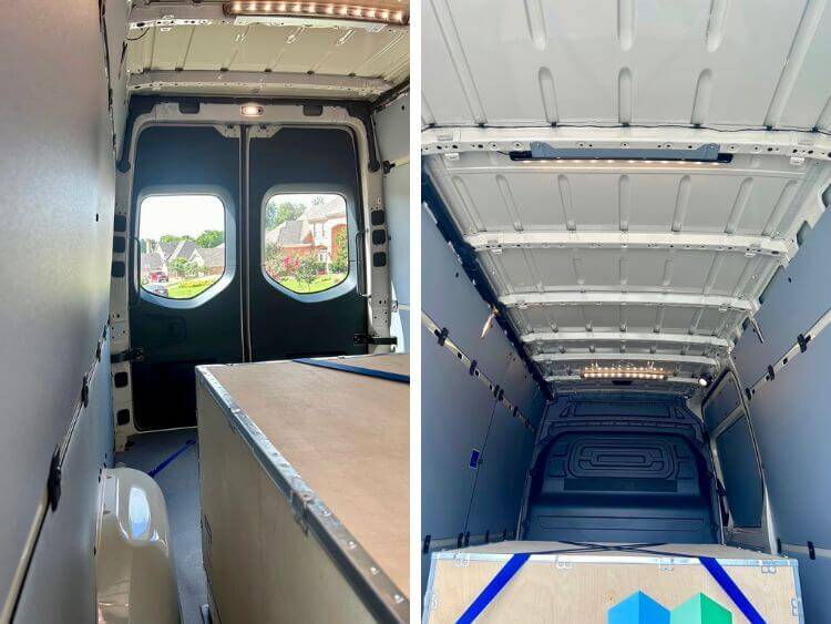 Behind the driver is a very well-insulated partition that separates the driver compartment from the cargo area. The eSprinter is whisper quiet inside, a bit of a shocker to me. I’ve driven a ton of cargo vans over the years and typically they are loud, rattly, and you get a lot of road noise. Absolutely not the case with this one