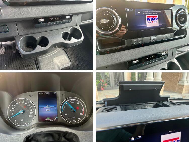 The cabin, believe it or not, is done in normal Mercedes-Benz style and is very nice, but remember, this is a work van. Lots of hard plastics cover the dash and door panels which looks very durable and easy to clean. Storage nooks, pockets, and a set of cupholders by the front windshield reinforce its functional design. There is a large glove box center dash that houses USB and USB-C ports, and a power outlet.