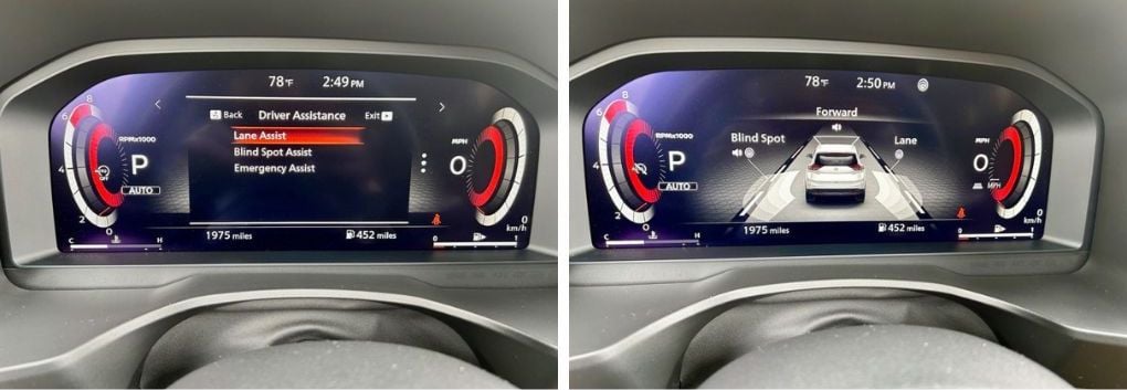 As you sit, the Nissan zero-gravity seats are comfortable and supportive. The flat-bottomed steering wheel is beautiful, and as you hit the start button, the new 12.3” digital dash comes to life, and it is really pleasant and easy to read, also colorful. This is a huge improvement.