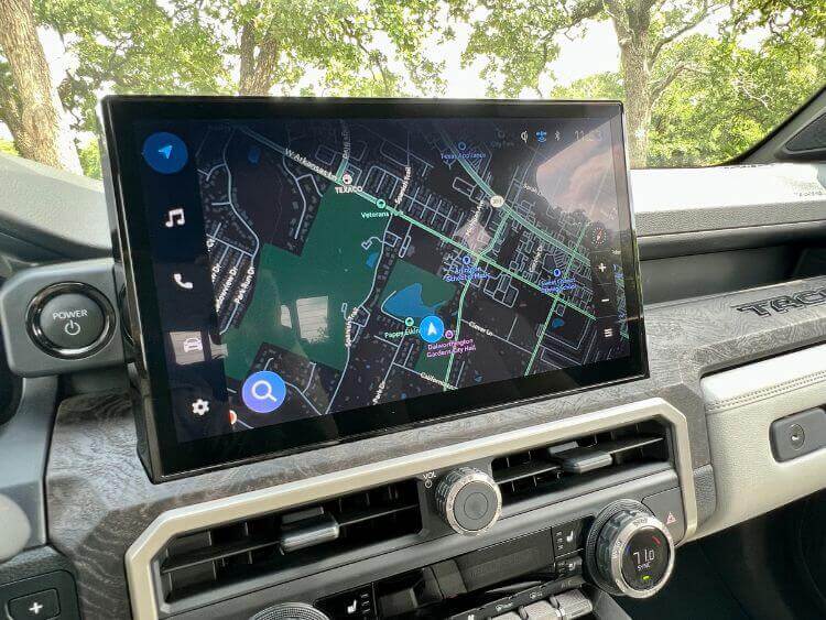The new Tacoma Limited benefits from a large 14-inch multimedia screen. The system is compatible with wireless Apple CarPlay and Android Auto. The touchscreen also houses navigation as well as the Limited's panoramic view monitor. The "Hey Toyota" voice command is wonderful. You can ask for the weather forecast - and also for it to turn down the cabin temp.