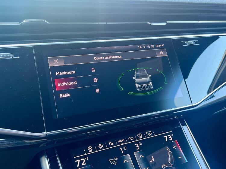 Standard Q7 55 safety features include forward collision warning and Automatic Emergency Braking, preventative occupant protection, adaptive cruise assist, lane departure warning, blind spot warning and rear cross traffic warning. There is also exit warning. You can control the level of Advanced Driver Assistance you want through the multimedia system. You can choose maximum, Individual or Basic.