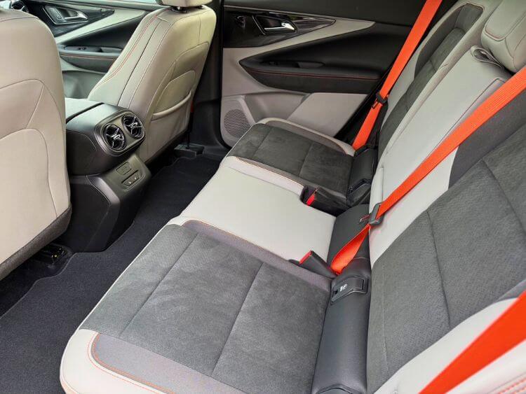 Moving to the back seat, there is a surprising amount of leg room and good headroom, and it has USBs, air vents, and a 110-volt power outlet for charging your devices.